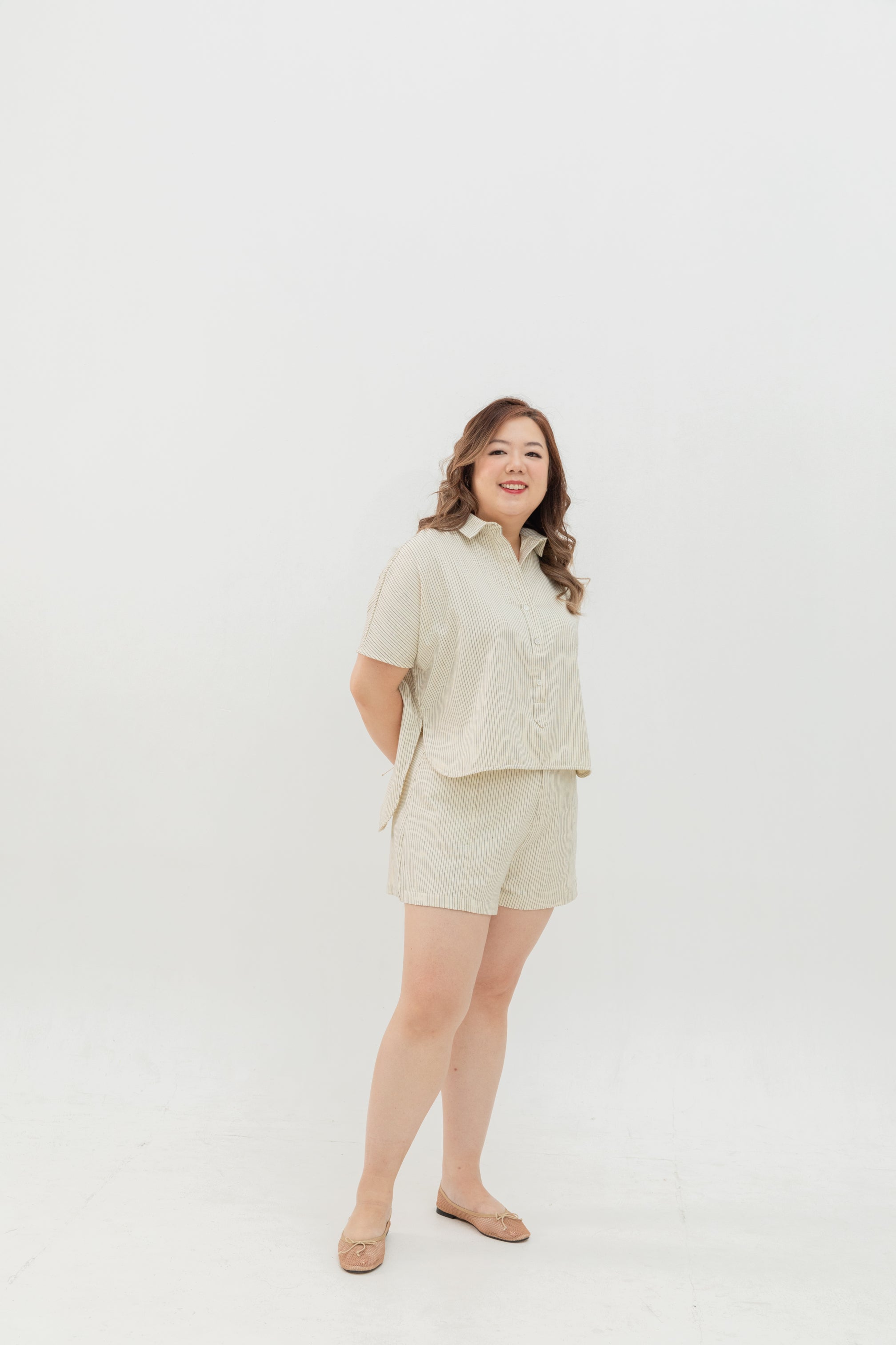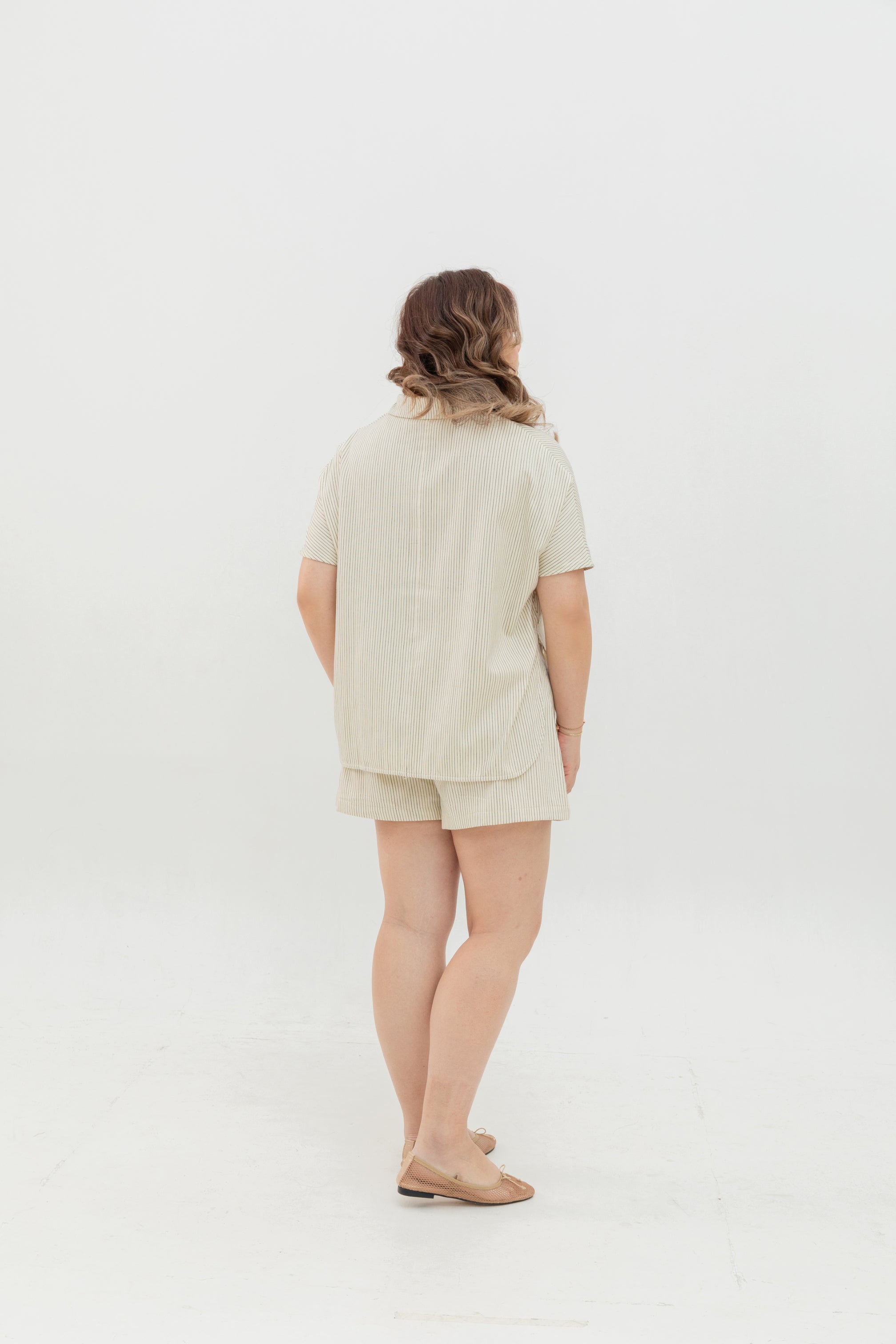 Breezy yet refined, the Coastal Stripes Shirt is designed with relaxed tailoring that makes everyday dressing effortlessly polished. Crafted from a breathable cotton-blend with fine vertical stripes, it elongates the frame while offering unmatched comfort. The boxy cut drapes lightly over the body, creating ease of movement without clinging, while the stepped hem with side slits adds a modern, flattering finish.