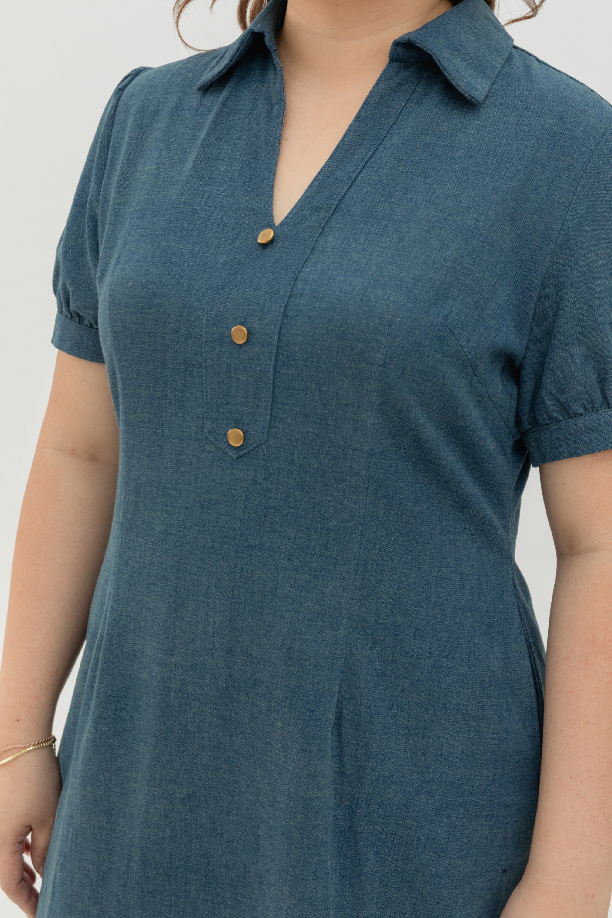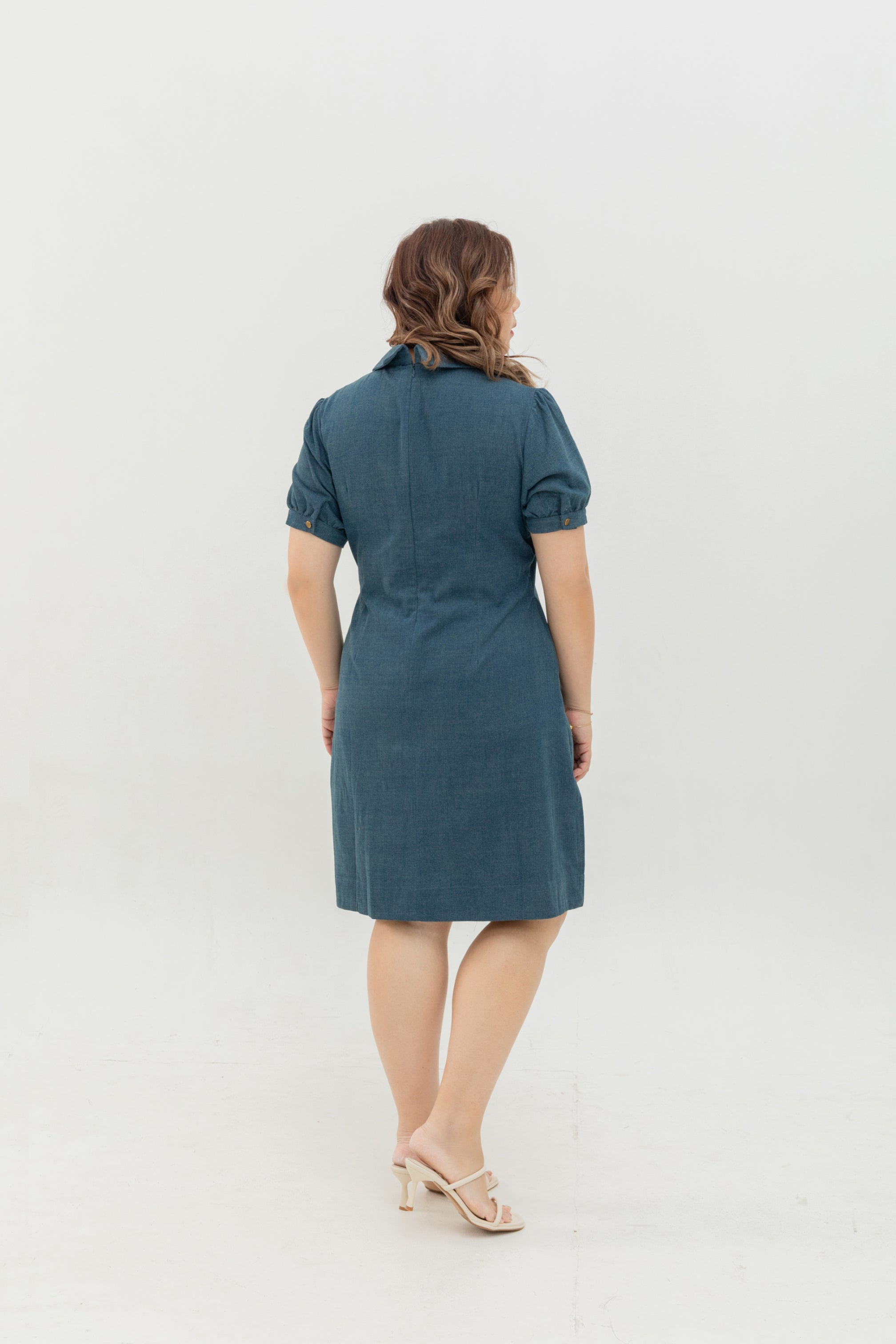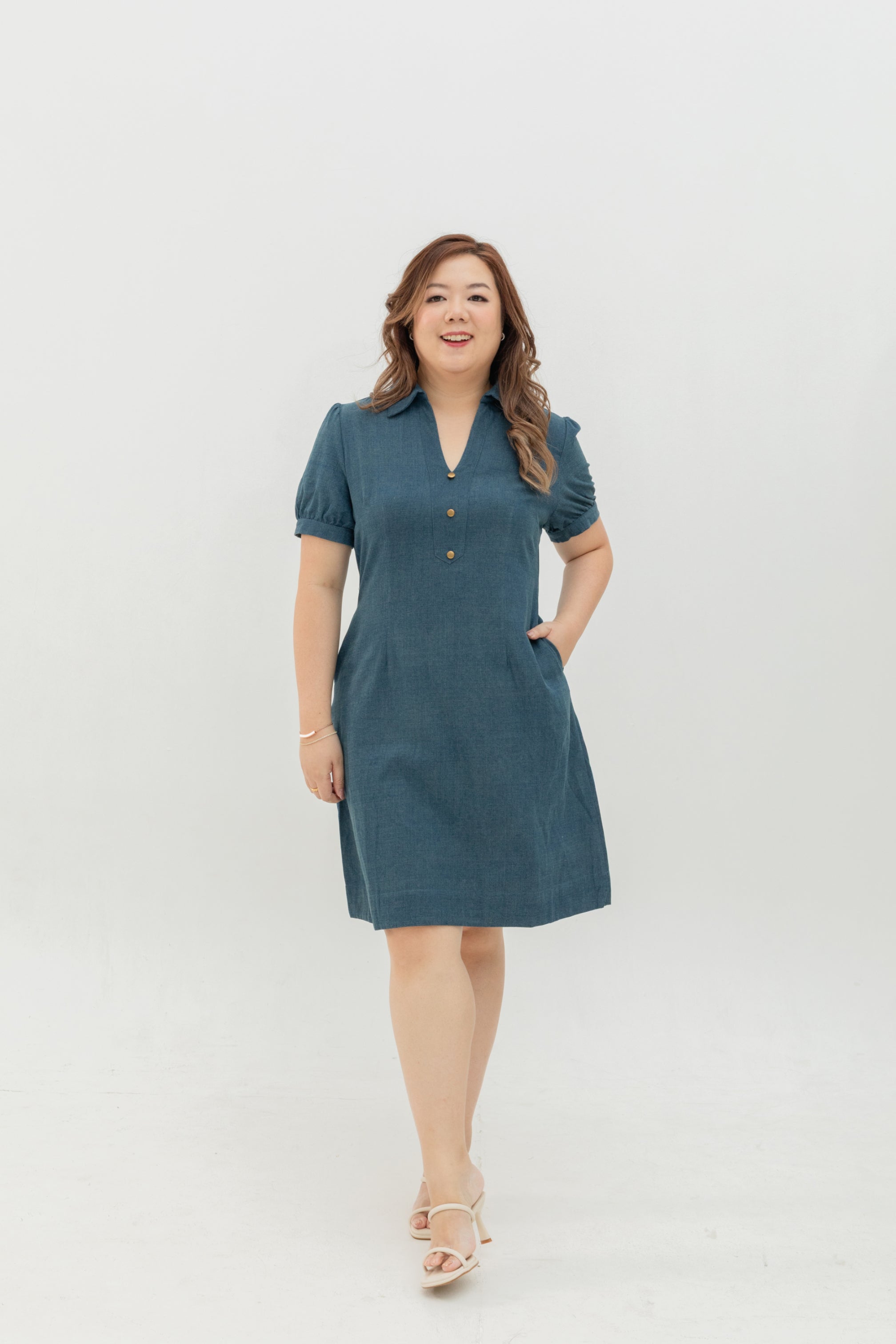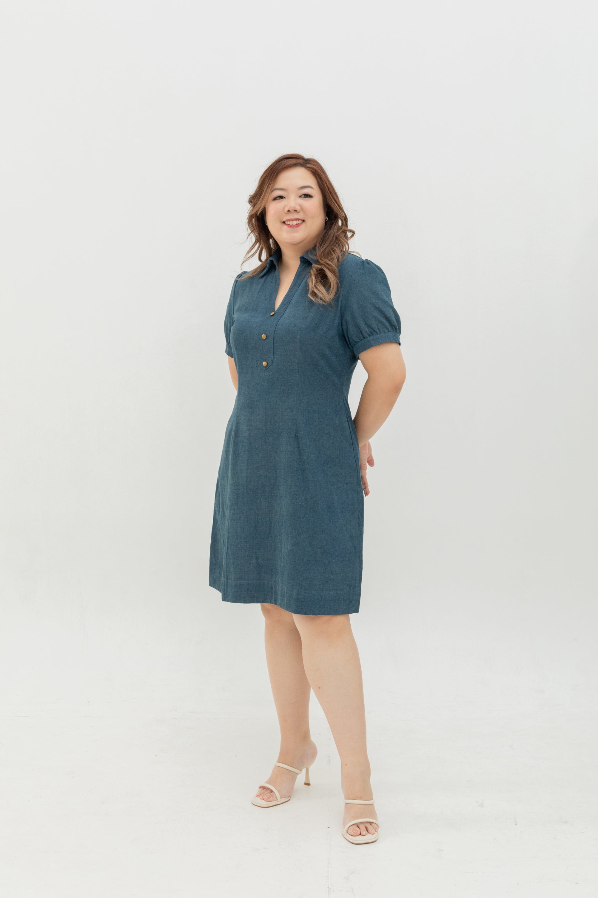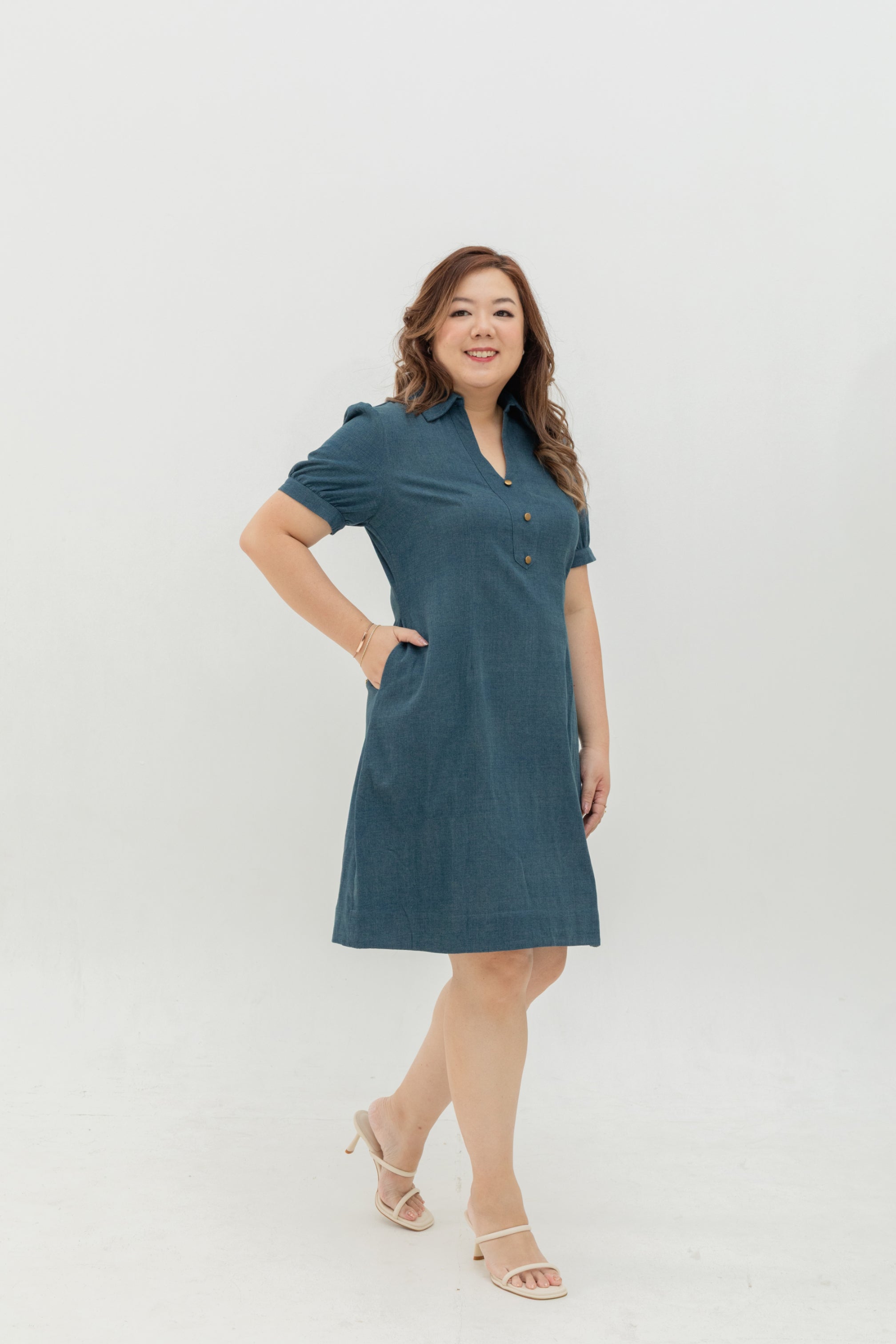 The shift silhouette skims gently over the body with a little allowance at the waist, creating shape without clinging and allowing for natural movement. Puff sleeves add a touch of softness, while the sleeve button closure has been thoughtfully extended so you can easily adjust the arm opening — simply restitch the button for a roomier fit if needed. Subtle tailoring ensures the dress holds a flattering form, balancing polish and comfort in one go-to piece.