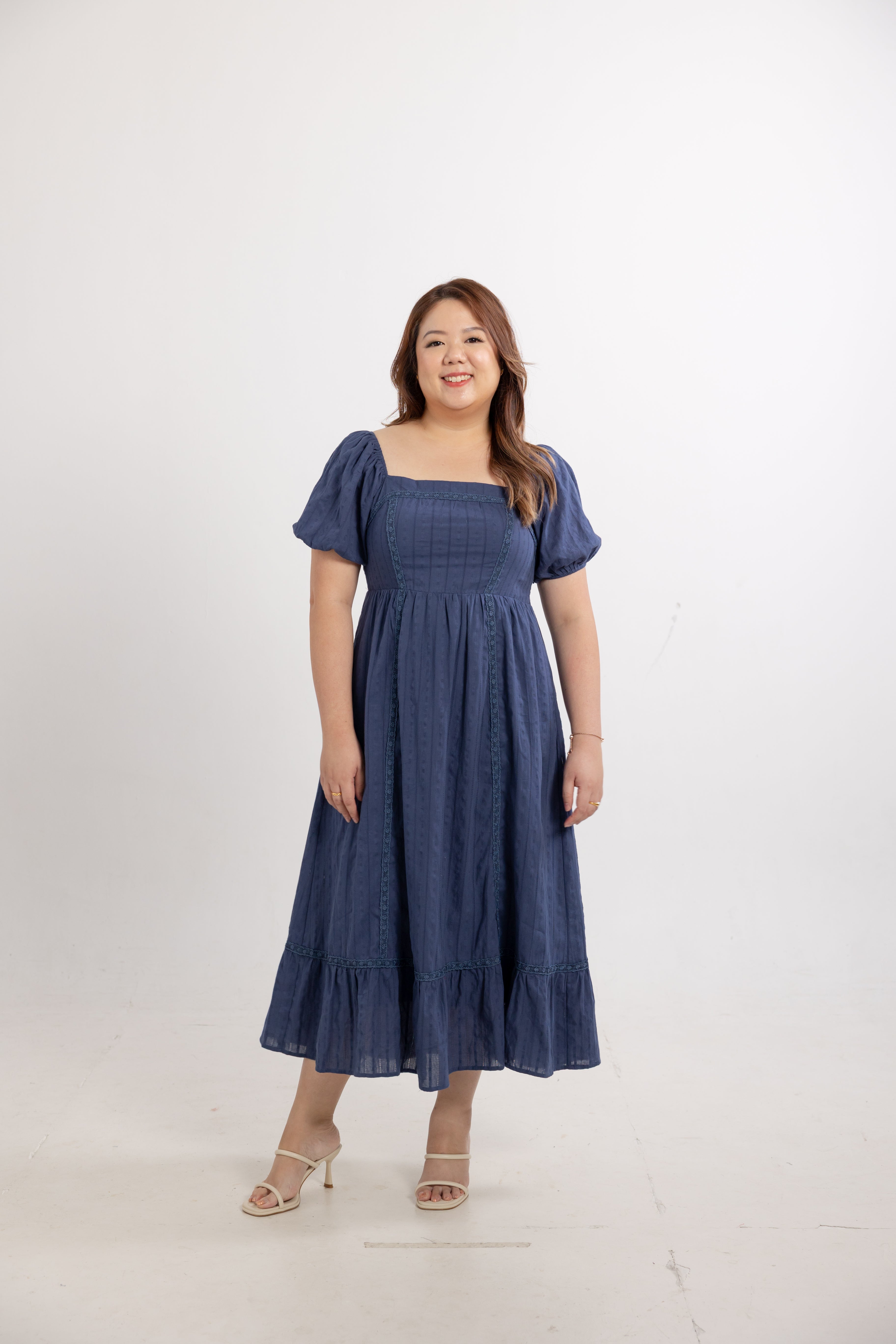 The softly squared neckline frames the collarbone with quiet elegance, complemented by softly gathered puff sleeves that add balance and femininity without excess volume. A fully smocked back panel provides flexible ease through the bust and waist, allowing the dress to adapt naturally to different body shapes while maintaining a flattering, softly defined silhouette.