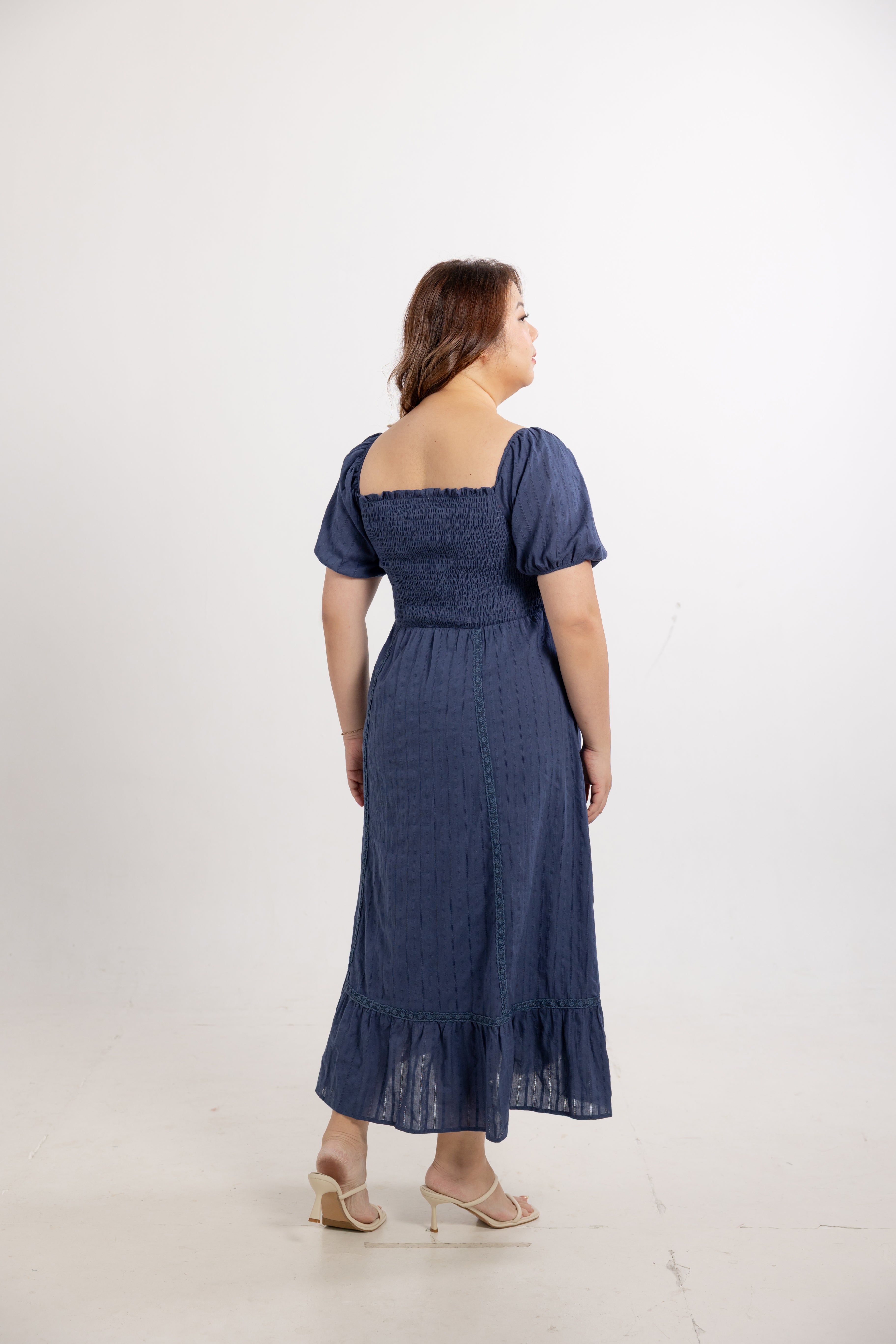 Lace Panel Smocked-back Midi Dress (Indigo Thread)