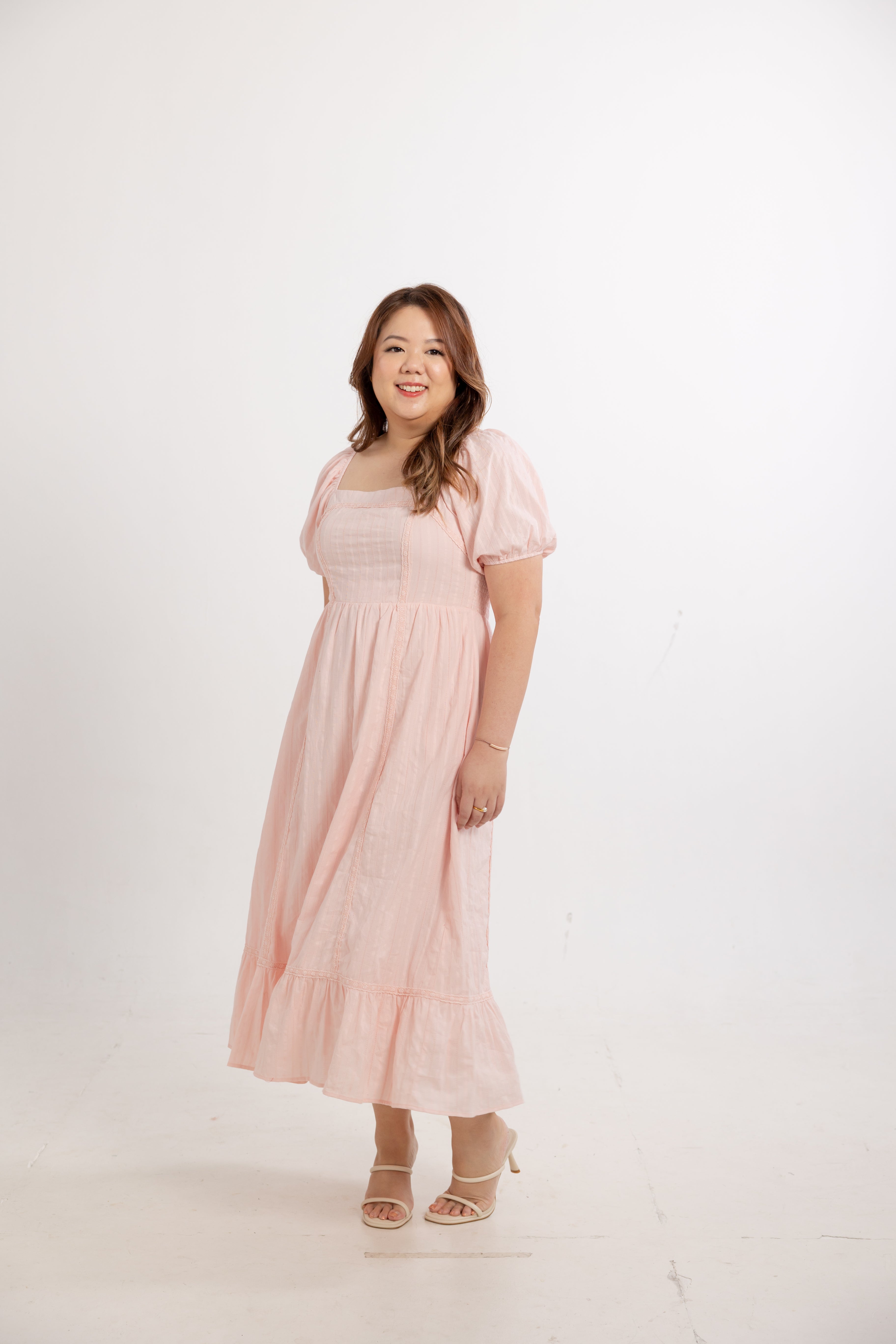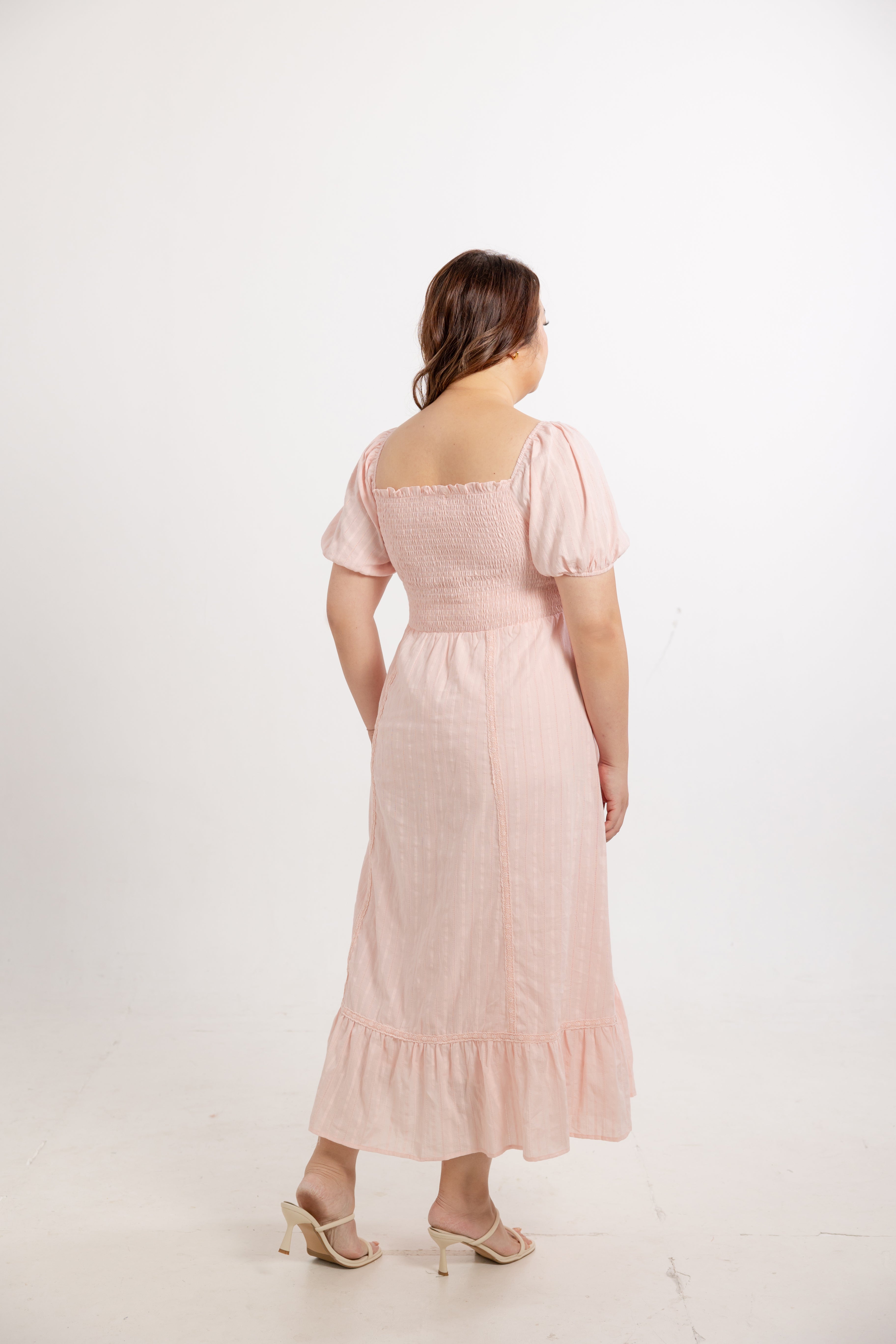 The softly squared neckline frames the collarbone with quiet elegance, complemented by softly gathered puff sleeves that add balance and femininity without excess volume. A fully smocked back panel provides flexible ease through the bust and waist, allowing the dress to adapt naturally to different body shapes while maintaining a flattering, softly defined silhouette.