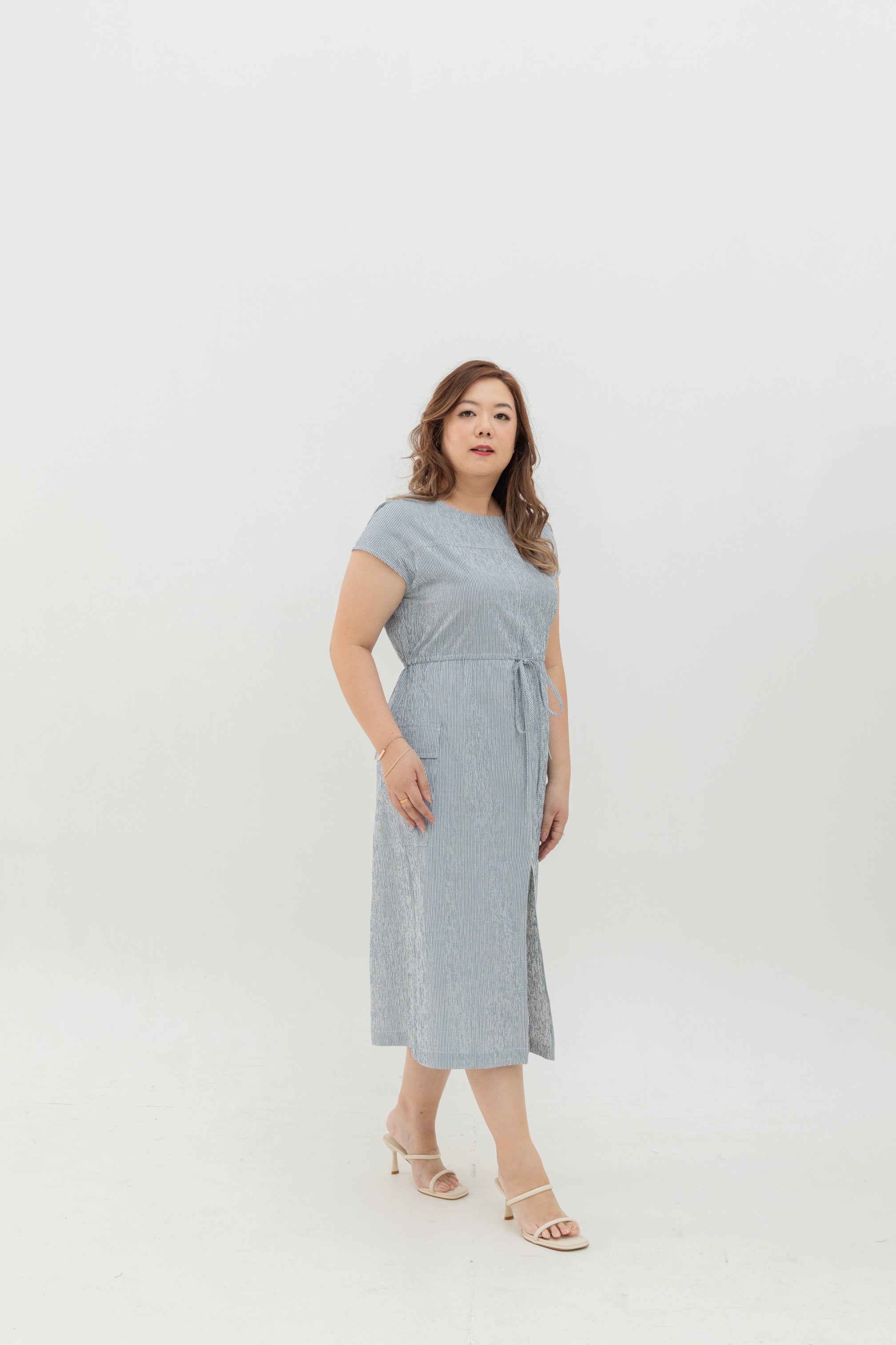 The round neckline and cap sleeves create a clean, modern frame, balanced by an elastic-back drawstring waist that offers both comfort and the option to cinch for definition. A front and back slit adds subtle movement, while the front patch pockets lend practical charm to its minimalist design.