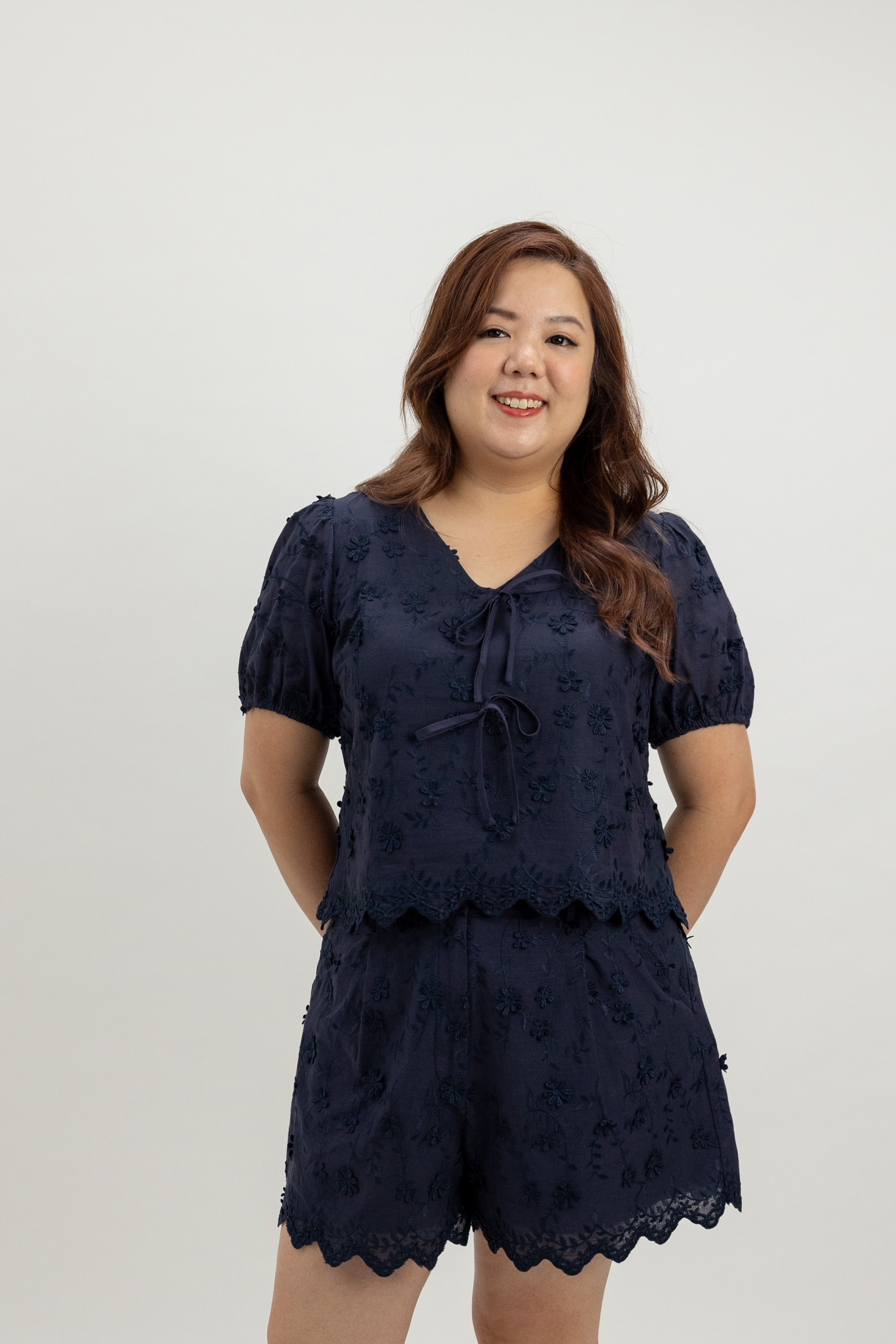 Finished with a subtle V-neckline, tie detail and a scalloped hem, this blouse shapes the waist beautifully while staying breathable for warm-weather days.
