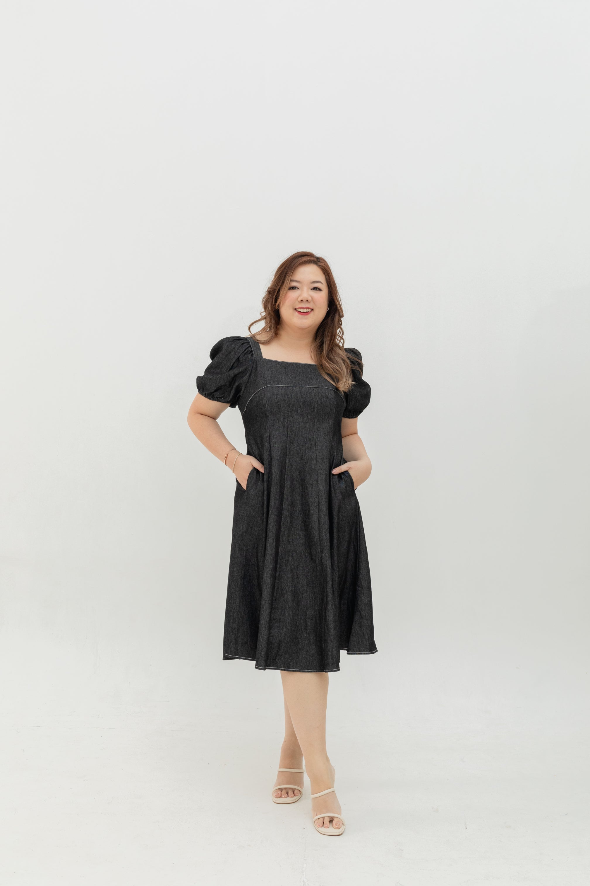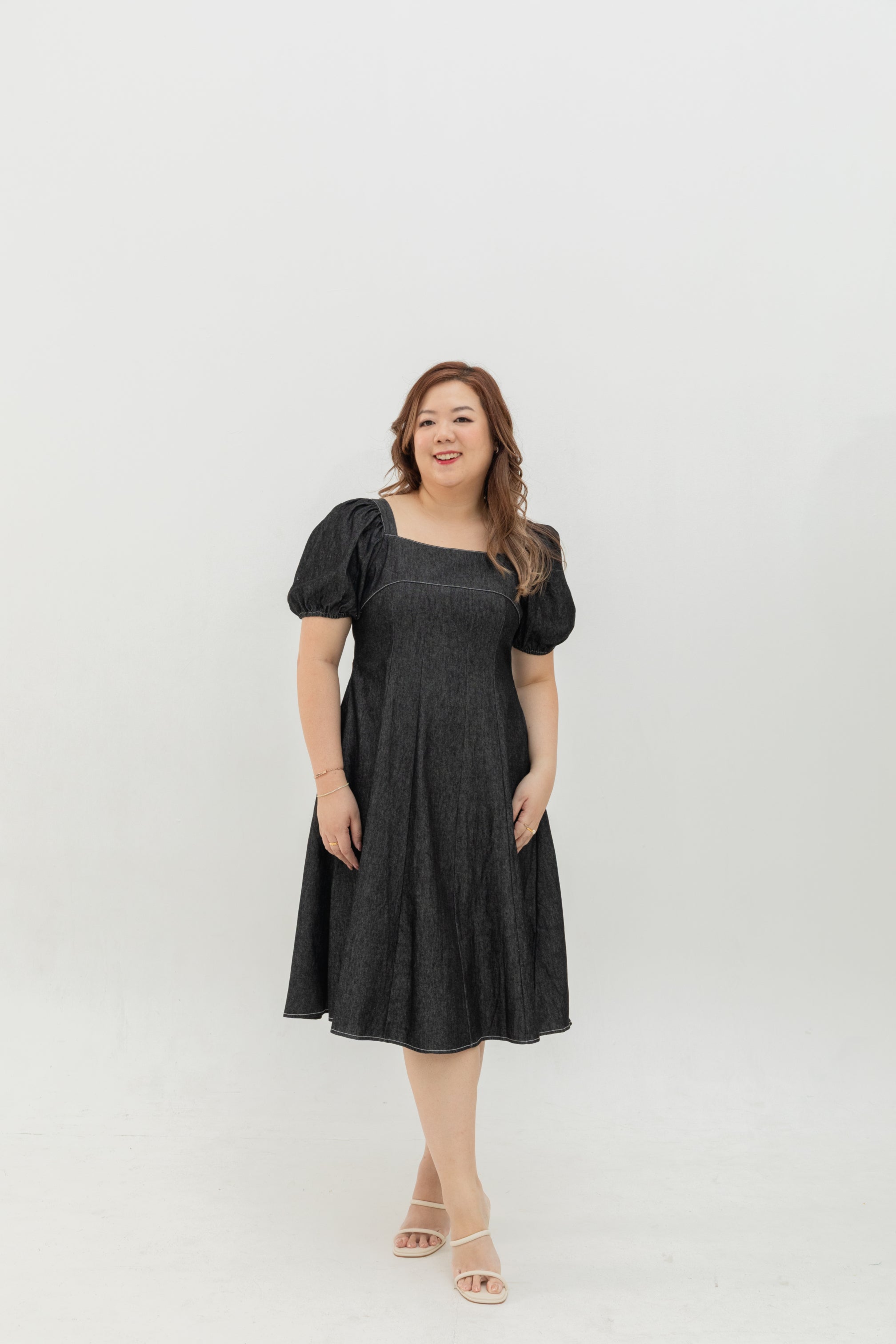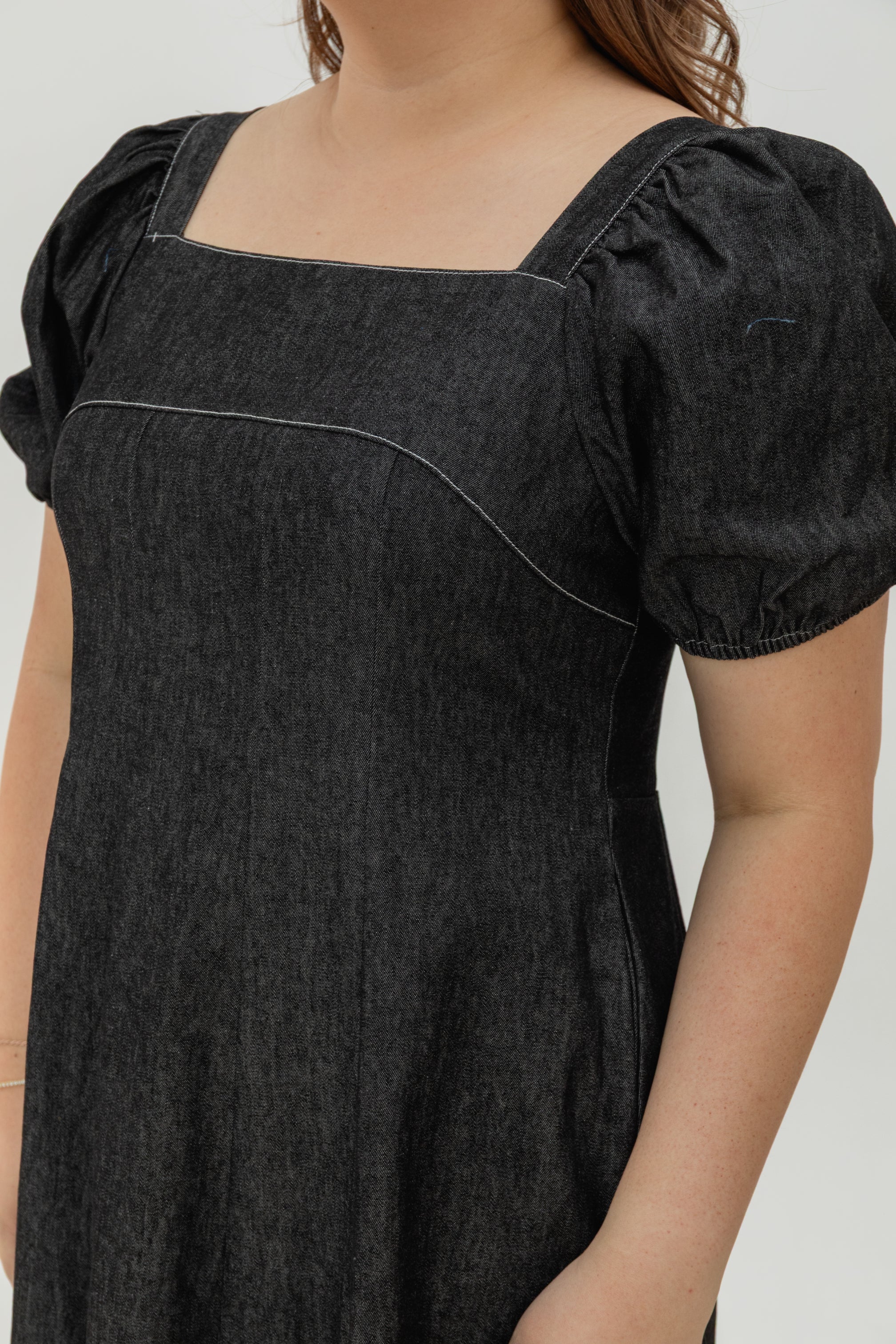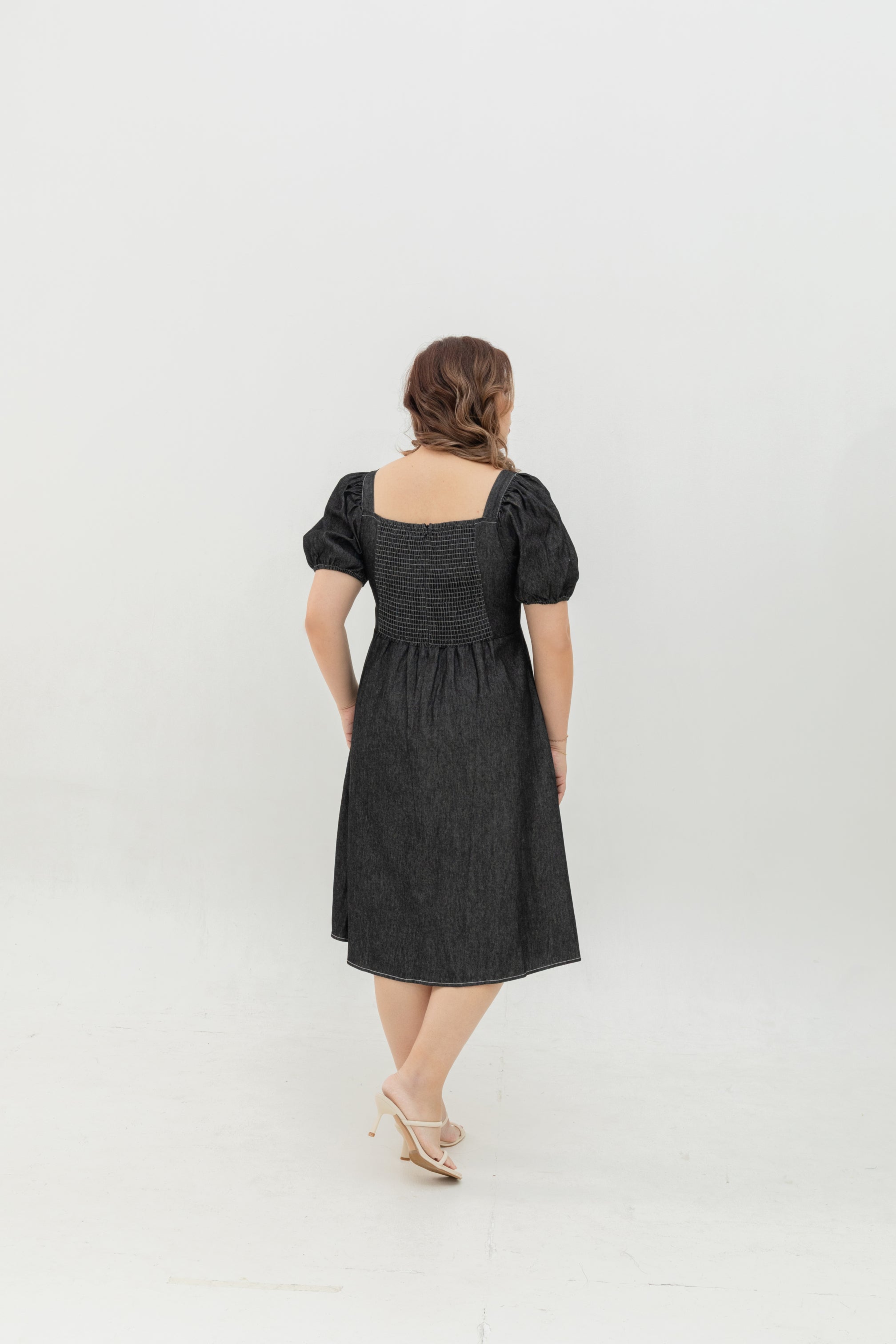 Relaxed yet refined, the Smocked-Back Soft Denim Dress is thoughtfully tailored to flatter every curve. Cut from a lightweight, breathable soft denim, it drapes effortlessly with just the right structure to hold its shape. The square neckline frames the collarbone elegantly, while the soft puff sleeves add a feminine touch. A smocked back panel ensures flexible comfort and a forgiving fit through the bust and waist — creating a naturally contoured silhouette that moves with you.