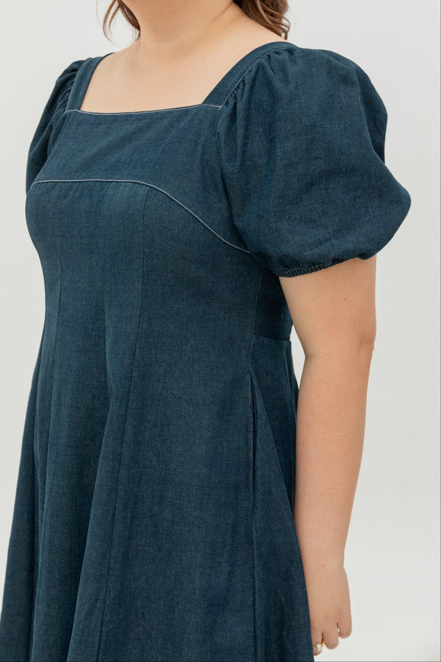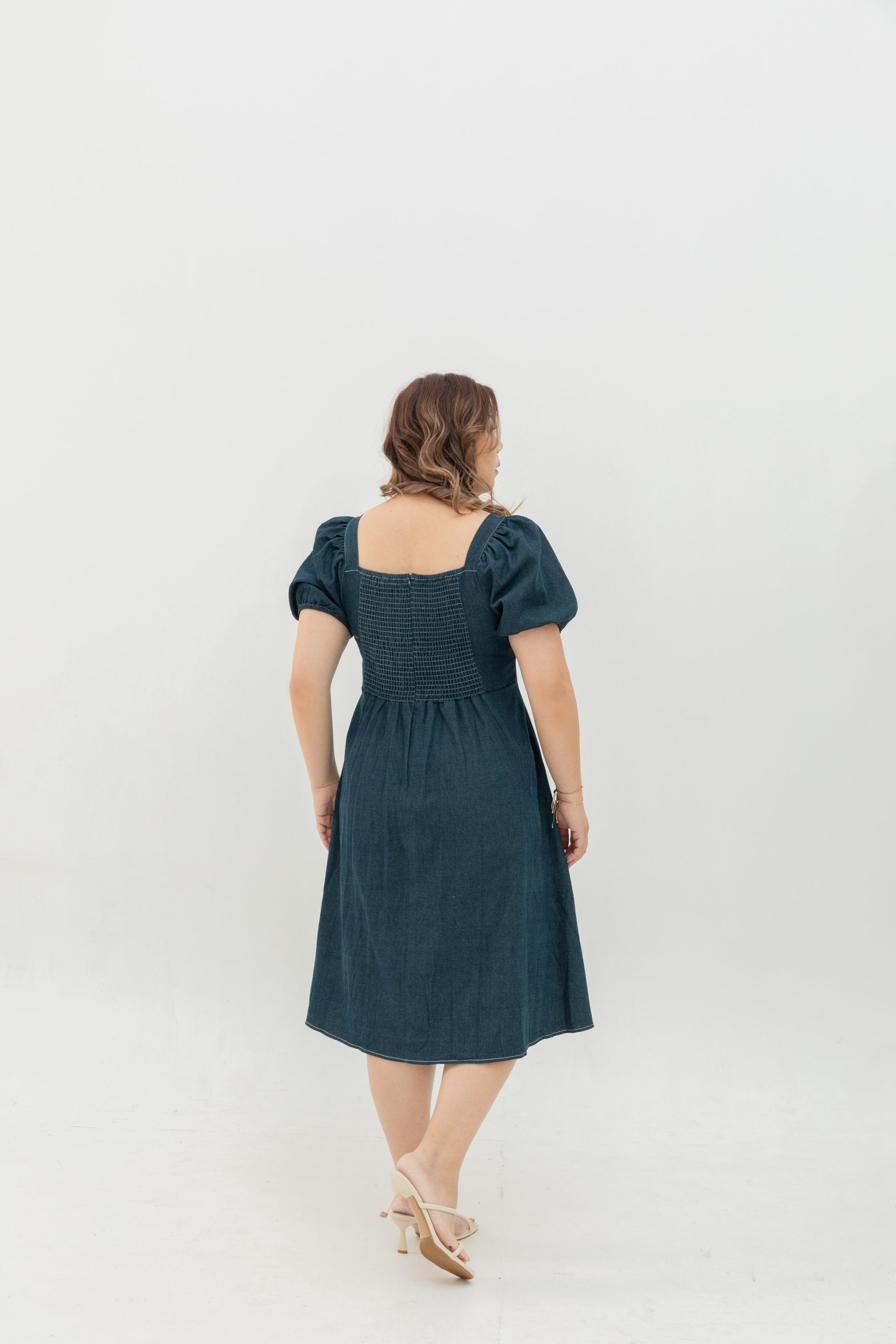 Relaxed yet refined, the Smocked-Back Soft Denim Dress is thoughtfully tailored to flatter every curve. Cut from a lightweight, breathable soft denim, it drapes effortlessly with just the right structure to hold its shape. The square neckline frames the collarbone elegantly, while the soft puff sleeves add a feminine touch. A smocked back panel ensures flexible comfort and a forgiving fit through the bust and waist — creating a naturally contoured silhouette that moves with you.