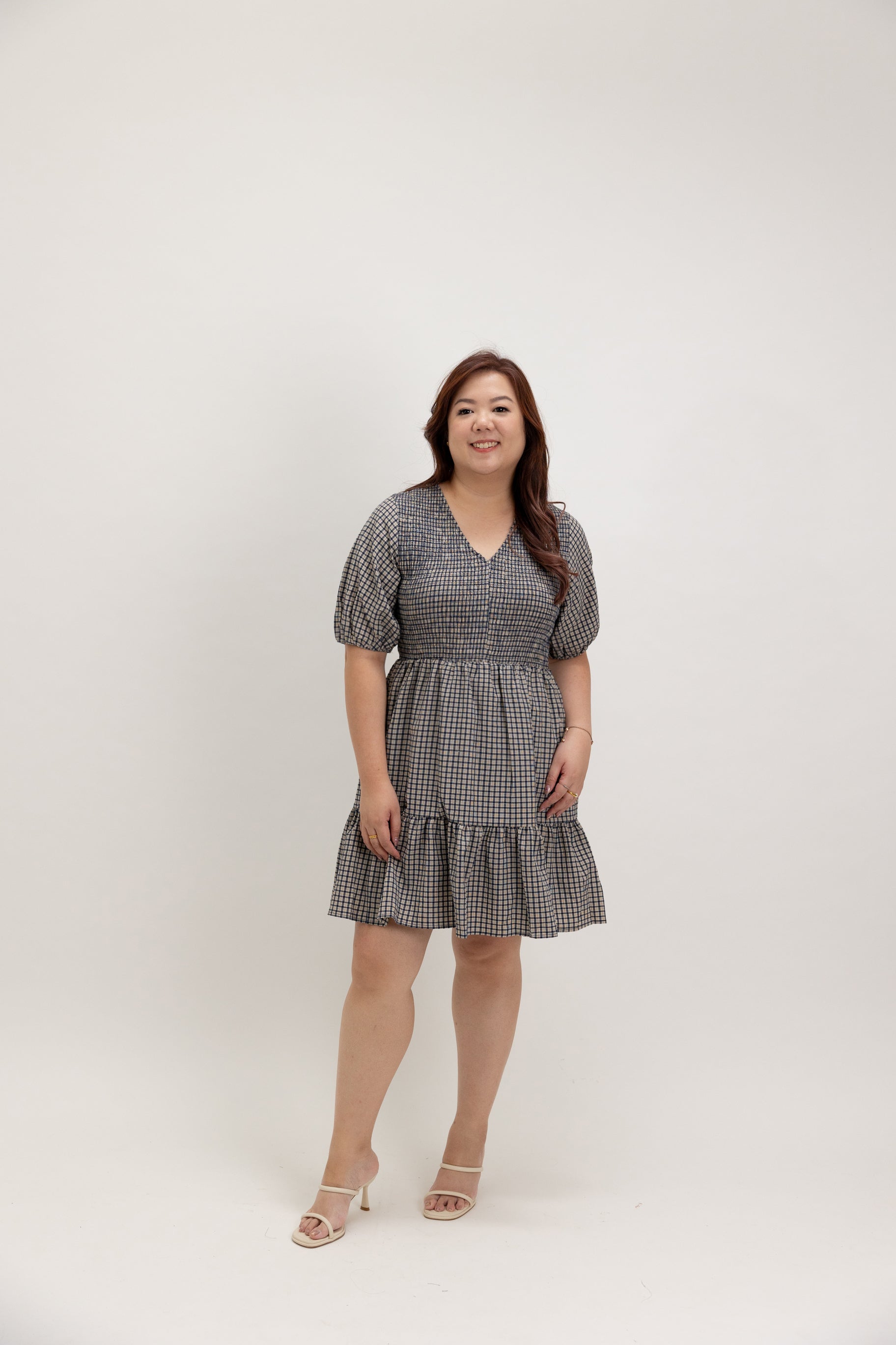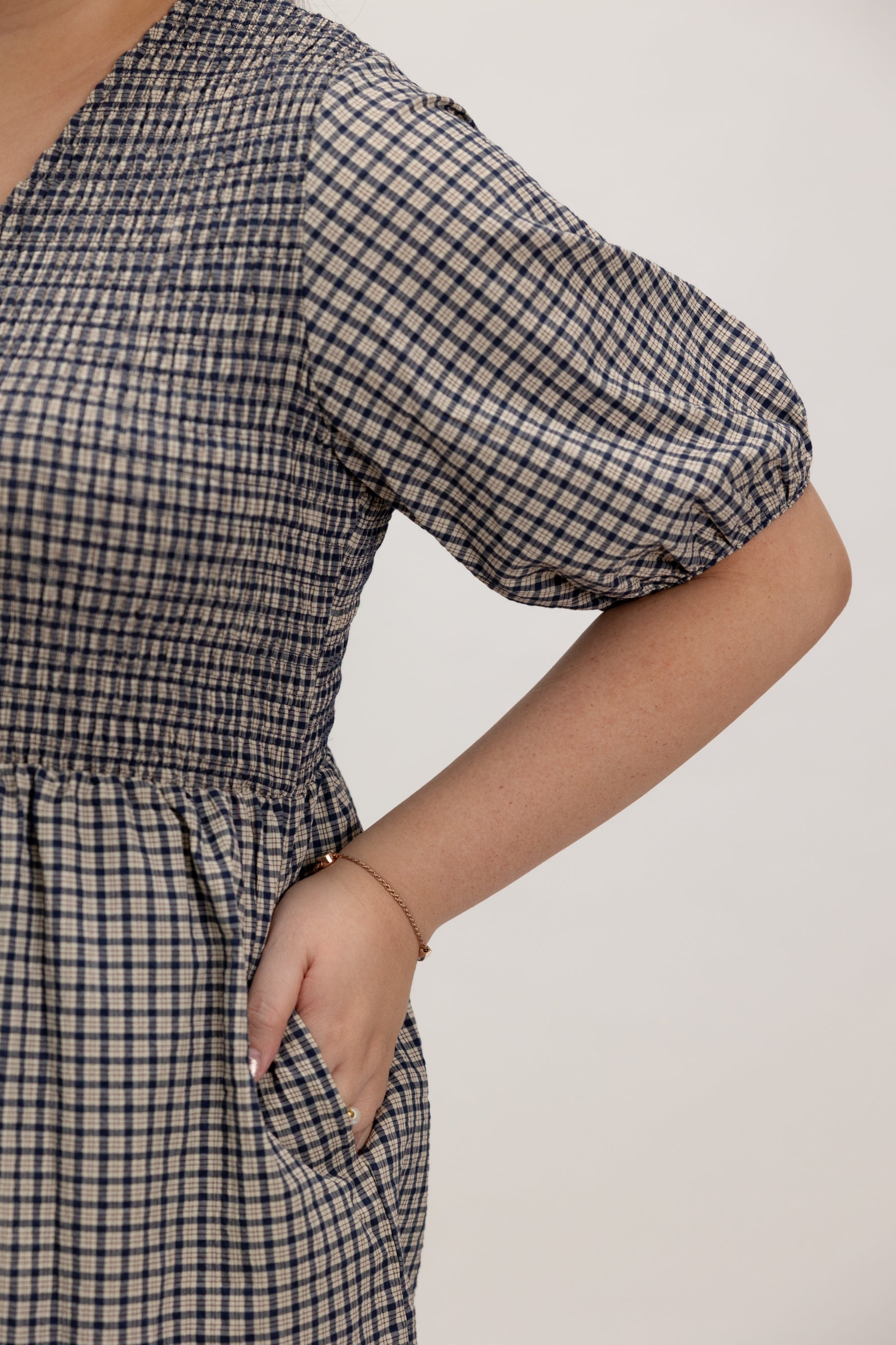 Smocked Empire Micro-check Dress (Navy)