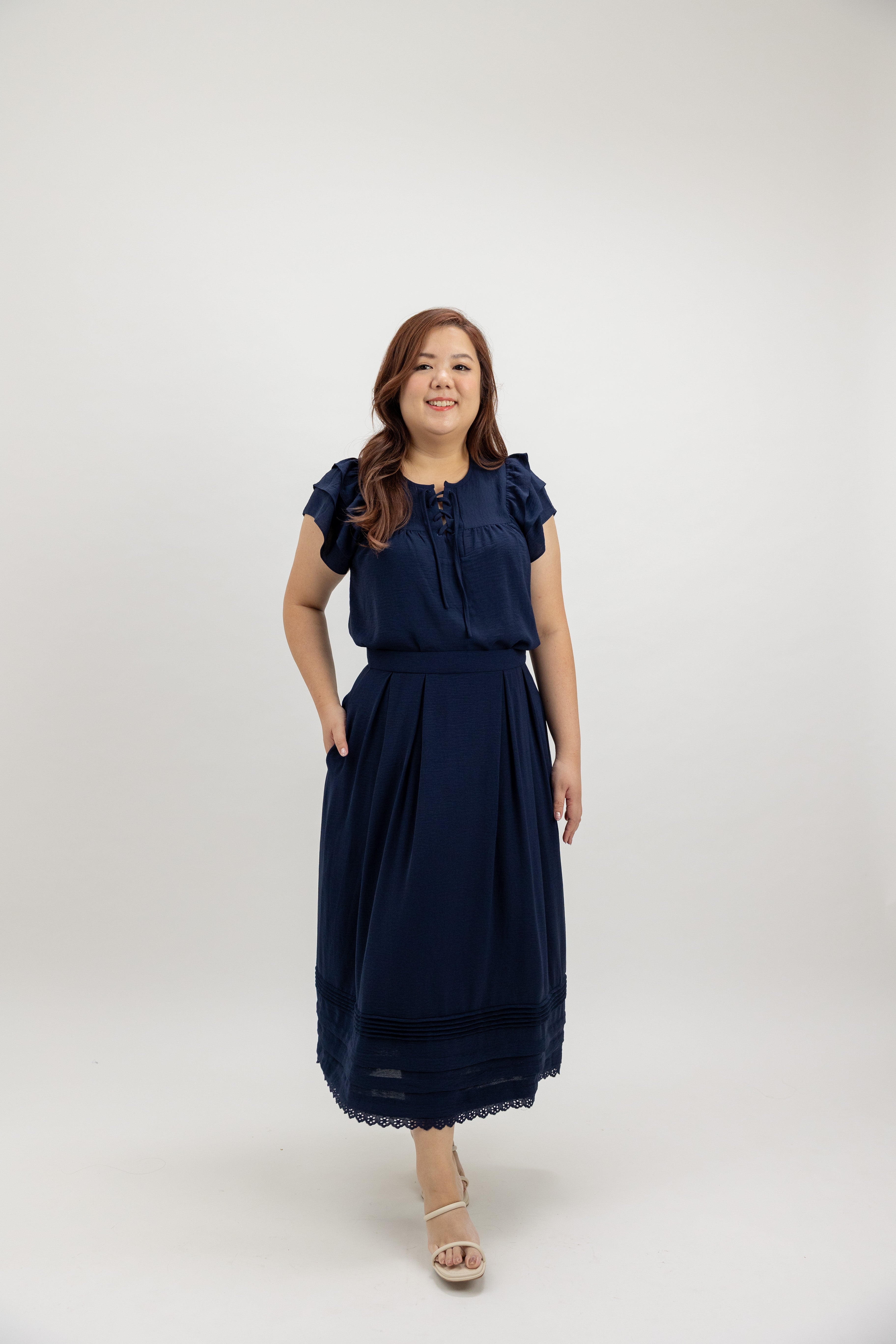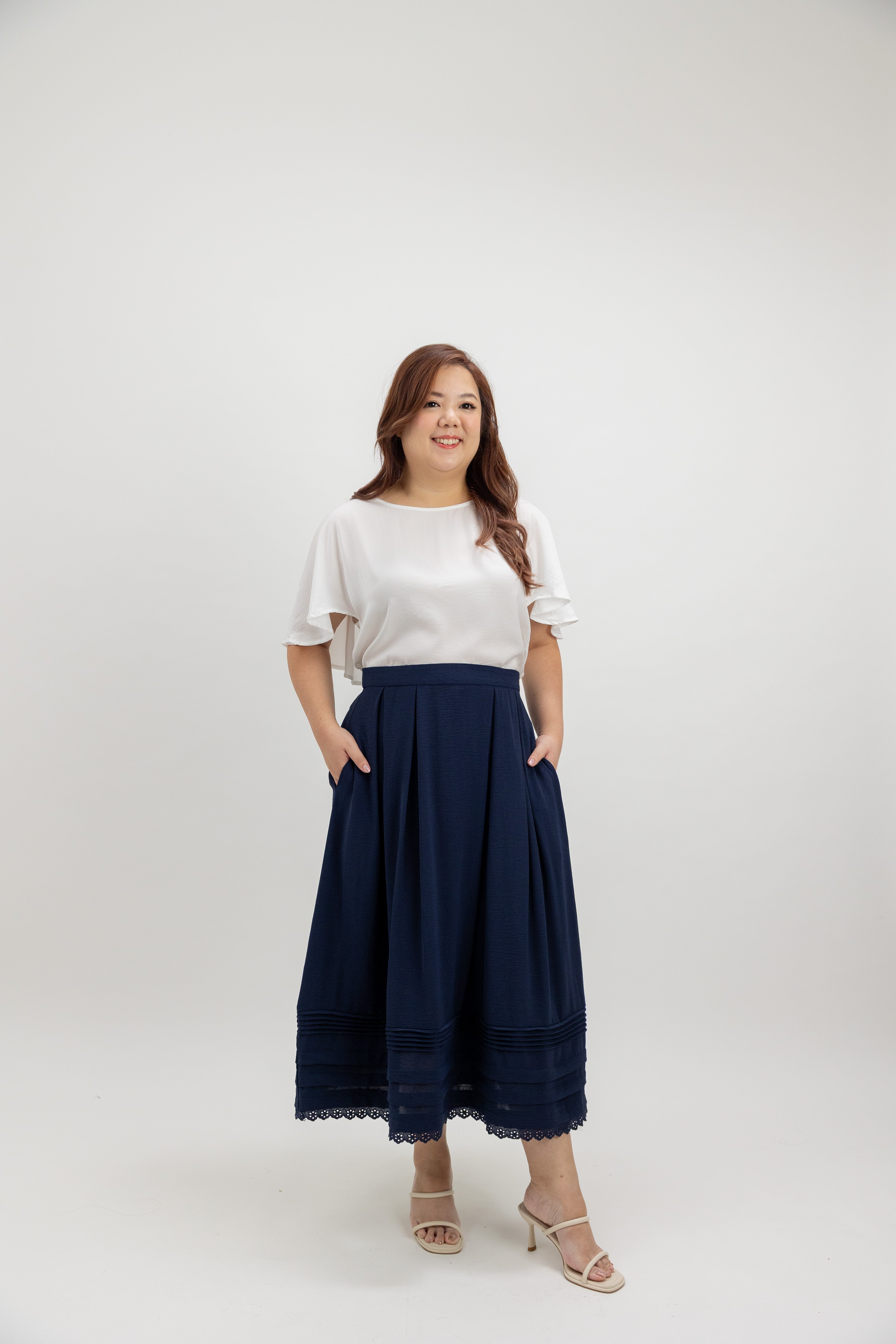 Designed with clean pleating and a structured waistband finish, it sits smoothly at the waist while flowing into a soft, airy midi silhouette.